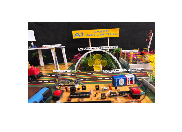 Abstract – To transform this automated setup into a truly Smart Agriculture System, the Arduino is interfaced with a Wi-Fi module (like the ESP8266 or NodeMCU) to connect to the Adafruit IO cloud server. This integration allows for real-time data visualization, where soil moisture levels, ambient temperature, and system alerts are sent to a personalized online dashboard. Instead of relying solely on the physical LCD, a farmer can monitor the health of their crops from anywhere in the world using a smartphone or computer. This integrated smart agriculture system utilizes an Arduino as the central controller. The soil moisture sensor triggers a water pump when dryness is detected, ensuring auto-irrigation. For temperature control, the LM35 sensor activates a cooling fan if the ambient temperature exceeds a set threshold. Security is provided by a piezo vibration sensor on the fence; any disturbance sounds a loud buzzer alarm. A rain sensor initiates two actions: it triggers a servo motor to close a protective roof over sensitive crops and simultaneously deactivates the irrigation pump to conserve water. A 16×2 LCD continuously displays real-time status of all parameters like soil moisture, temperature, and system alerts (e.g., “RAINING” or “INTRUDER ALERT”). The buzzer provides audible warnings for both the security breach and significant operational changes. All components are interconnected on a breadboard, powered appropriately, and managed through a single, consolidated Arduino sketch that reads all sensors and controls the actuators efficiently, creating a cohesive automated farming solution.