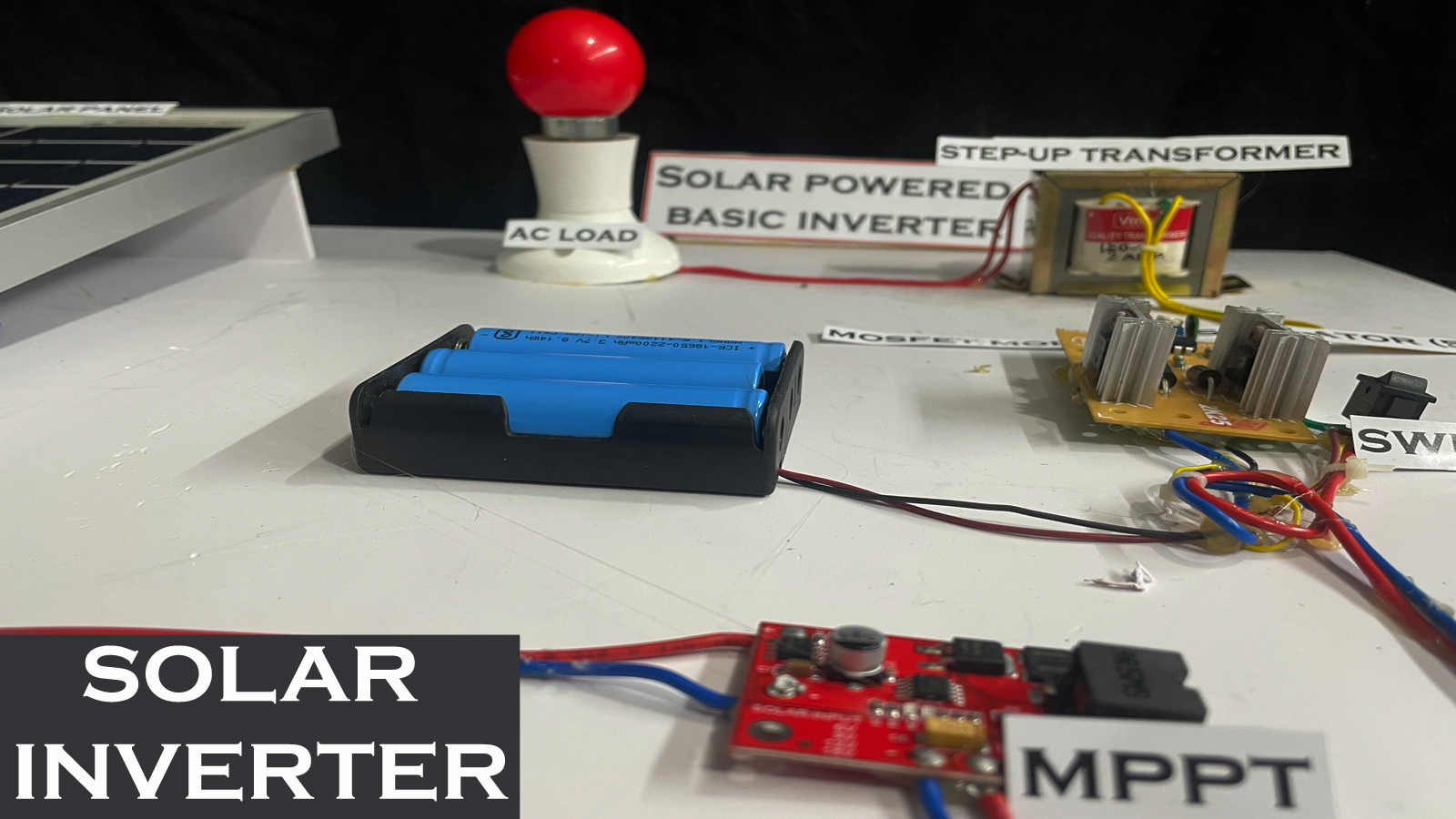 Abstarct – The process begins with the solar panel, which captures photons to generate DC electricity, which is then regulated by the MPPT (Maximum Power Point Tracking) controller to ensure the Lithium-ion battery bank (configured with three $3.7\text{V}$ cells) charges at peak efficiency. This stored DC energy provides the input voltage for the inverter circuit. The CD4047 IC acts as the heart of the system, configured as an astable multivibrator to produce a stable $50\text{Hz}$ square wave oscillation. These low-power pulses are fed into the gates of two IRF840 MOSFET modules, which act as high-speed switches, rapidly toggling the DC current in a push-pull configuration. This switching action creates an alternating magnetic field within the primary winding of a step-up transformer. The transformer then induces a higher voltage in its secondary winding, stepping the low-voltage DC pulses up to approximately $220\text{V}$ AC. Finally, this high-voltage output is used to drive the LED bulb AC load, completing the conversion from renewable solar energy to usable light.